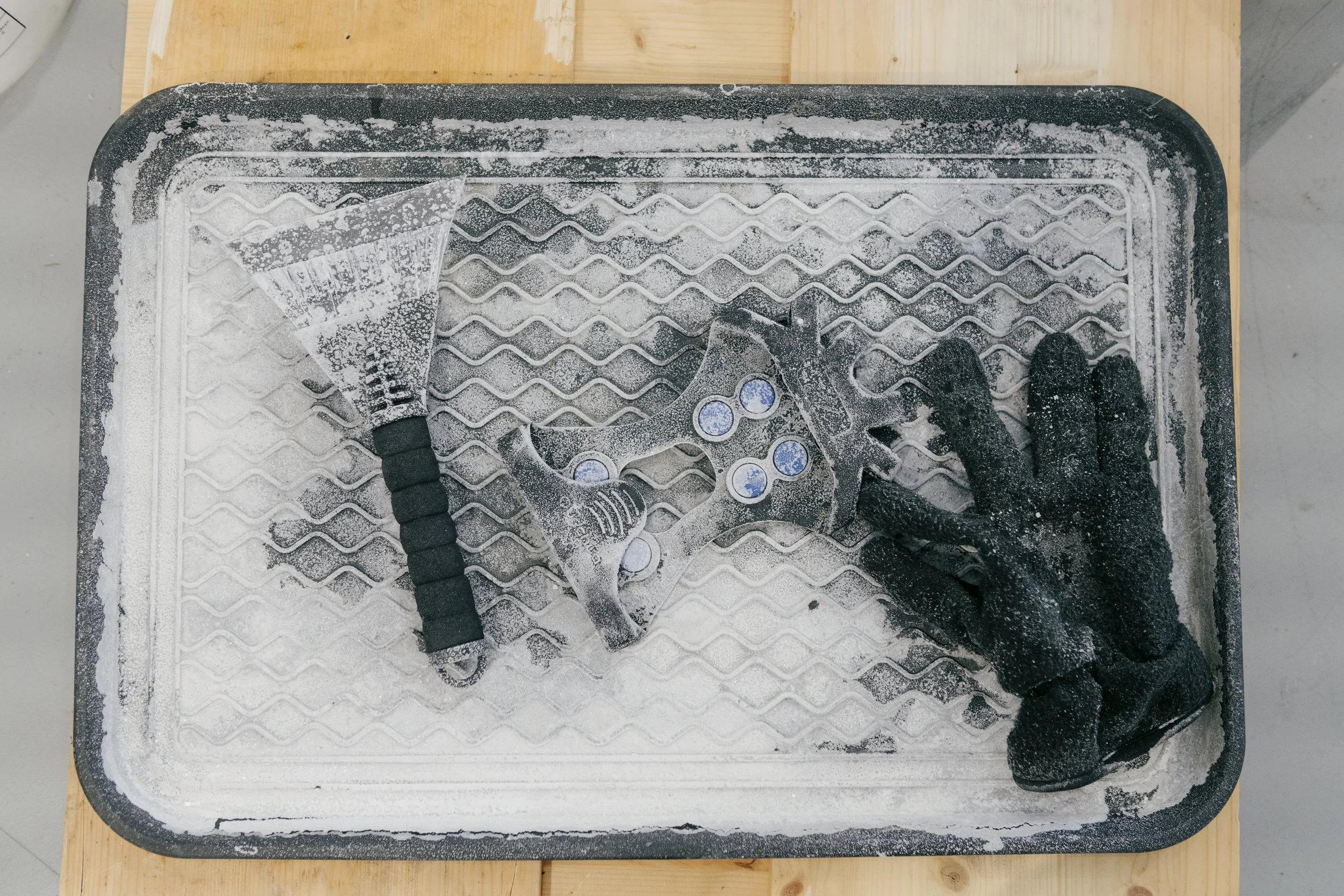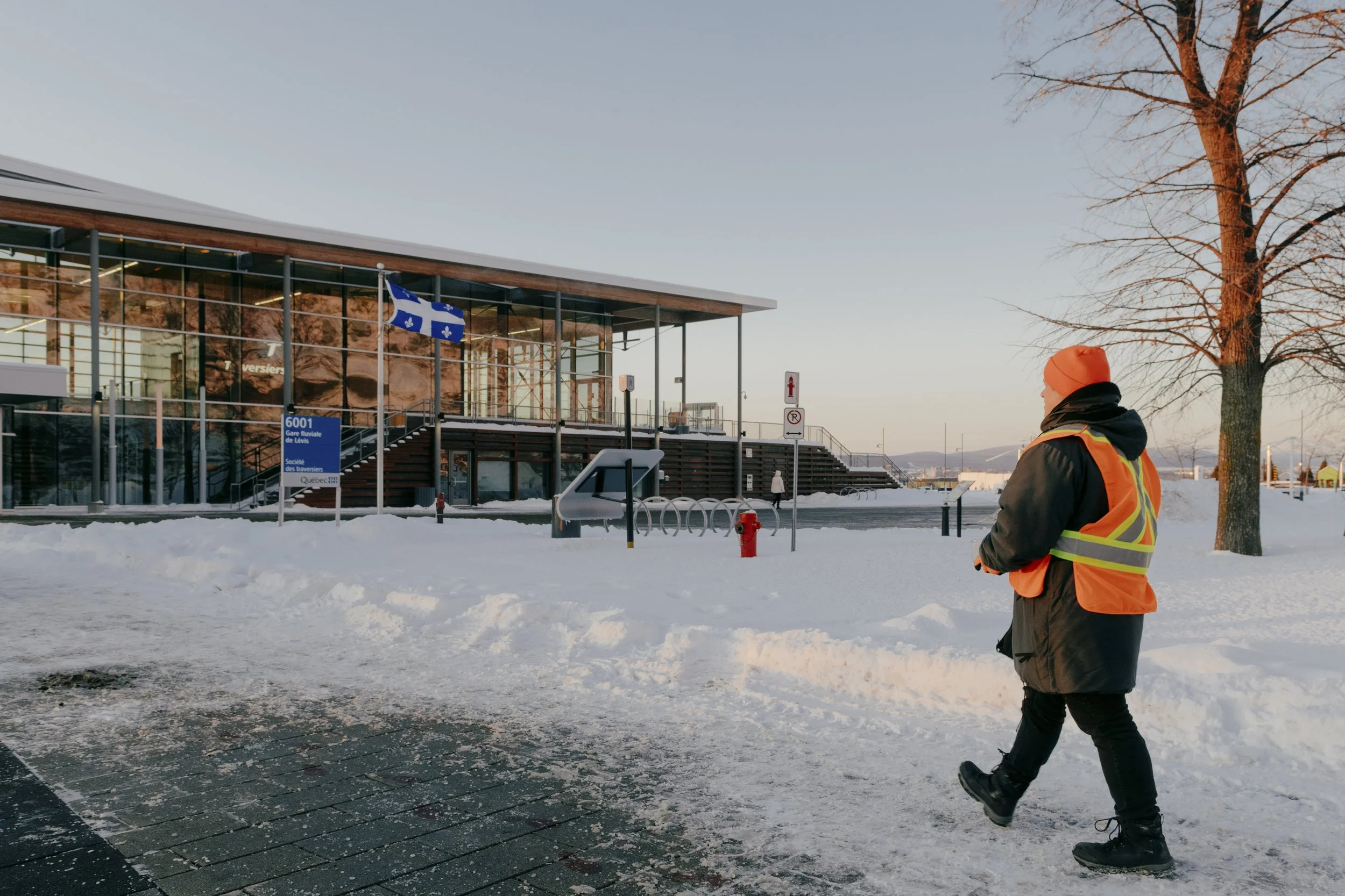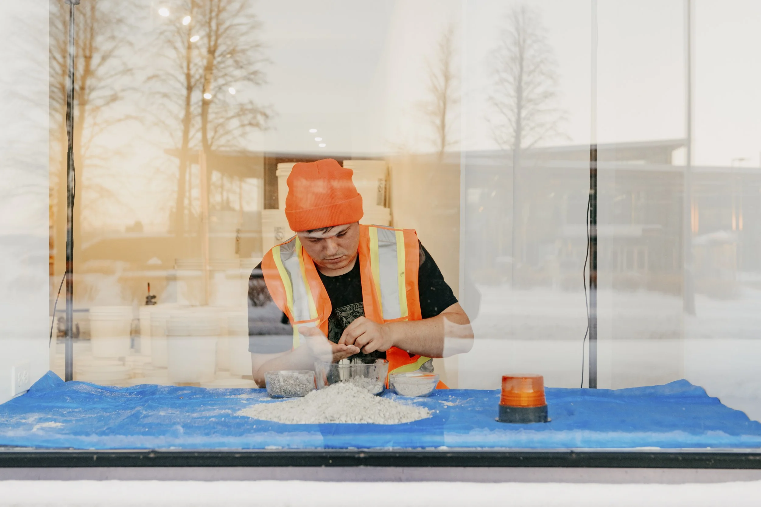 Because Maxime travelled daily between Québec and Lévis by ferry, the project was rhythmically structured by this crossing of the St. Lawrence River. In the morning, Maxime performed furtive actions on the ship’s deck; before boarding the ferry again in the evening, he placed the sorted salt, his work vest, and his gloves in the Regart display window located in the Lévis ferry terminal.