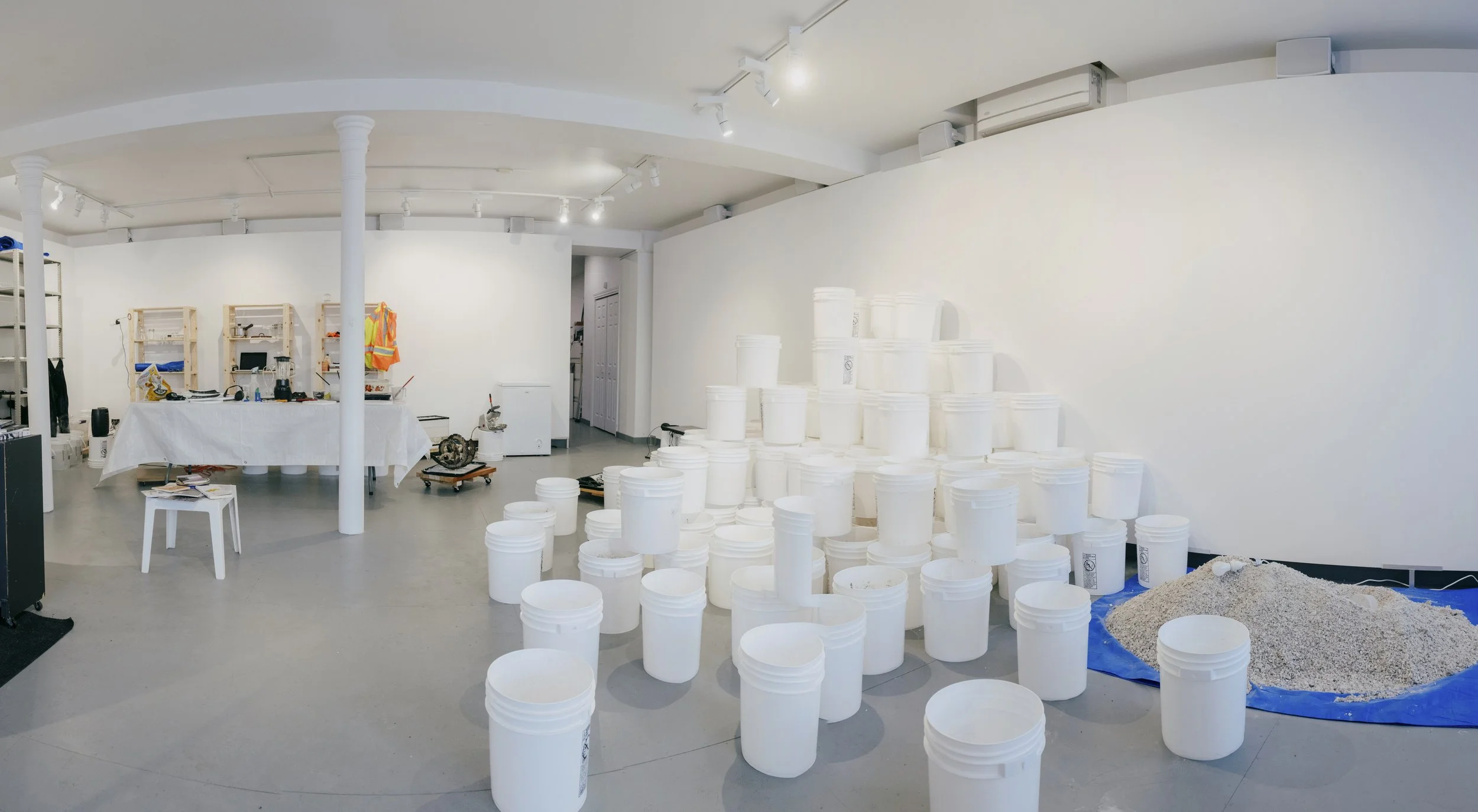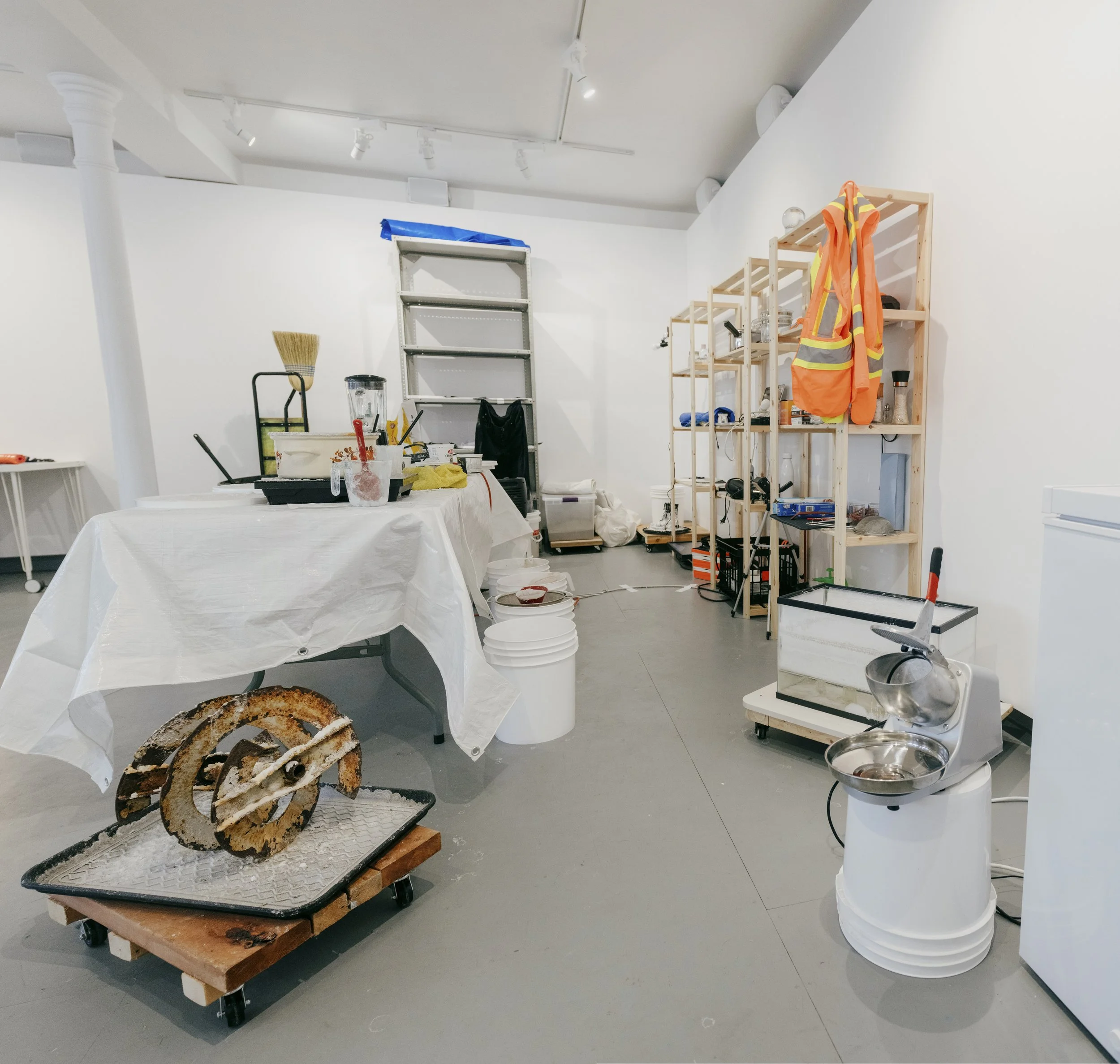 L’install’action centrale se voulait un lieu de rencontre entre les visiteurs et l’artiste. Mêlant fragments authentiques, reconstitutions et fictions, on y retrouvait des artefacts d’actions antérieures, un coin café et lecture comptant plus de 70 livres pour petits et grands traitant de l’hiver, ainsi qu’une série de vidéos et d’œuvres bricolées sur place. Le tout formait une sorte de chantier d’archivage activé quotidiennement durant toute la durée de l’exposition.