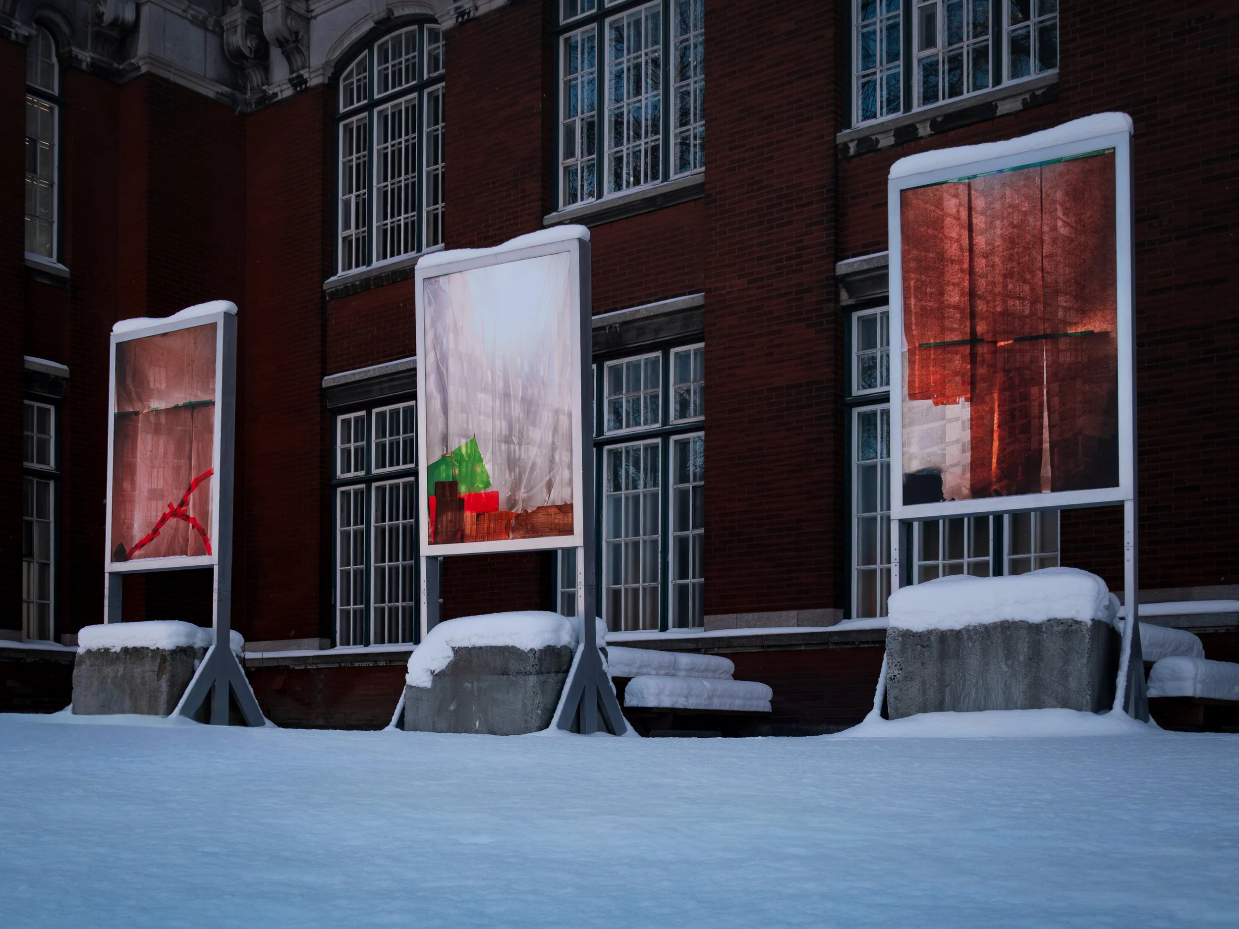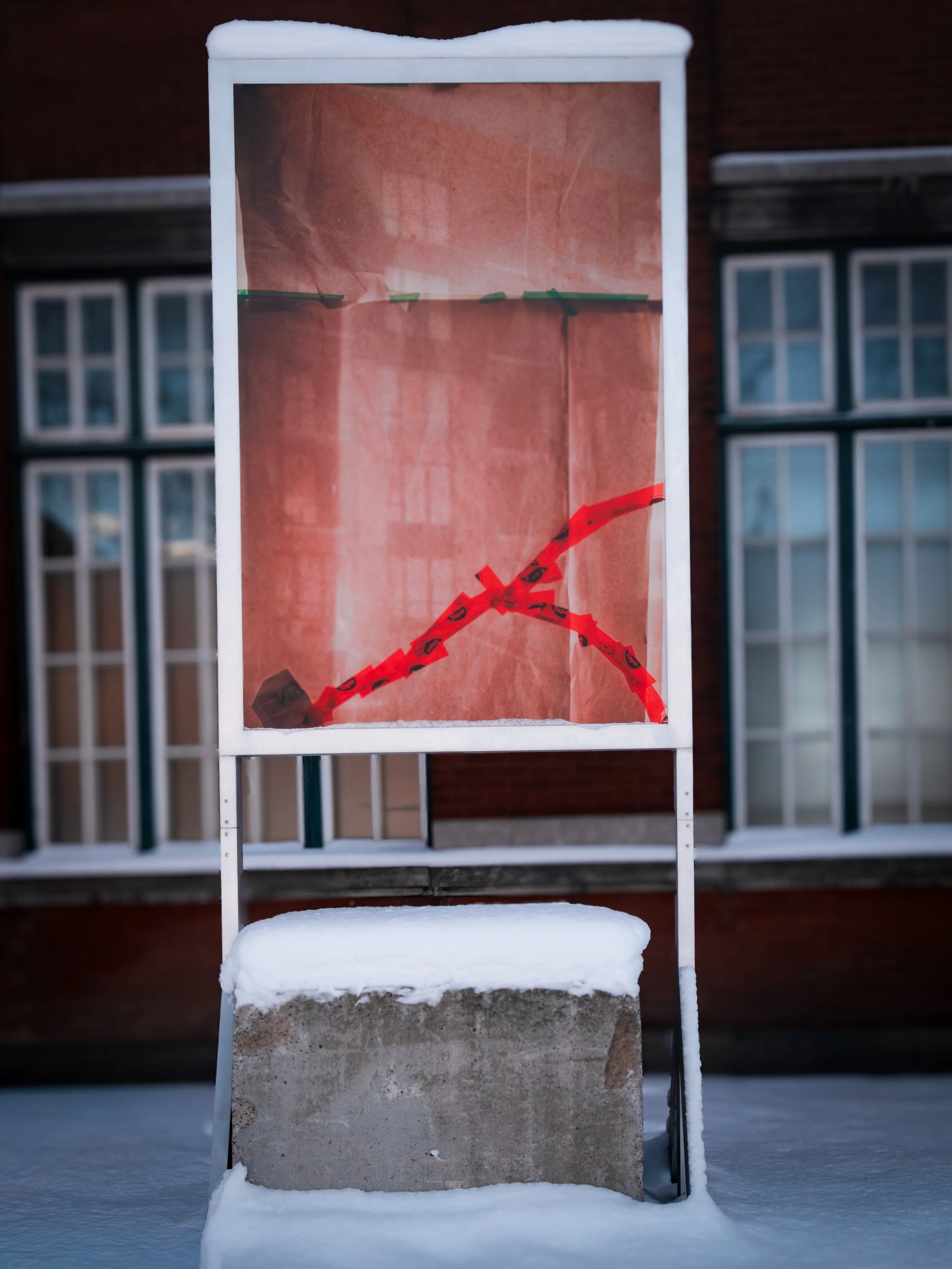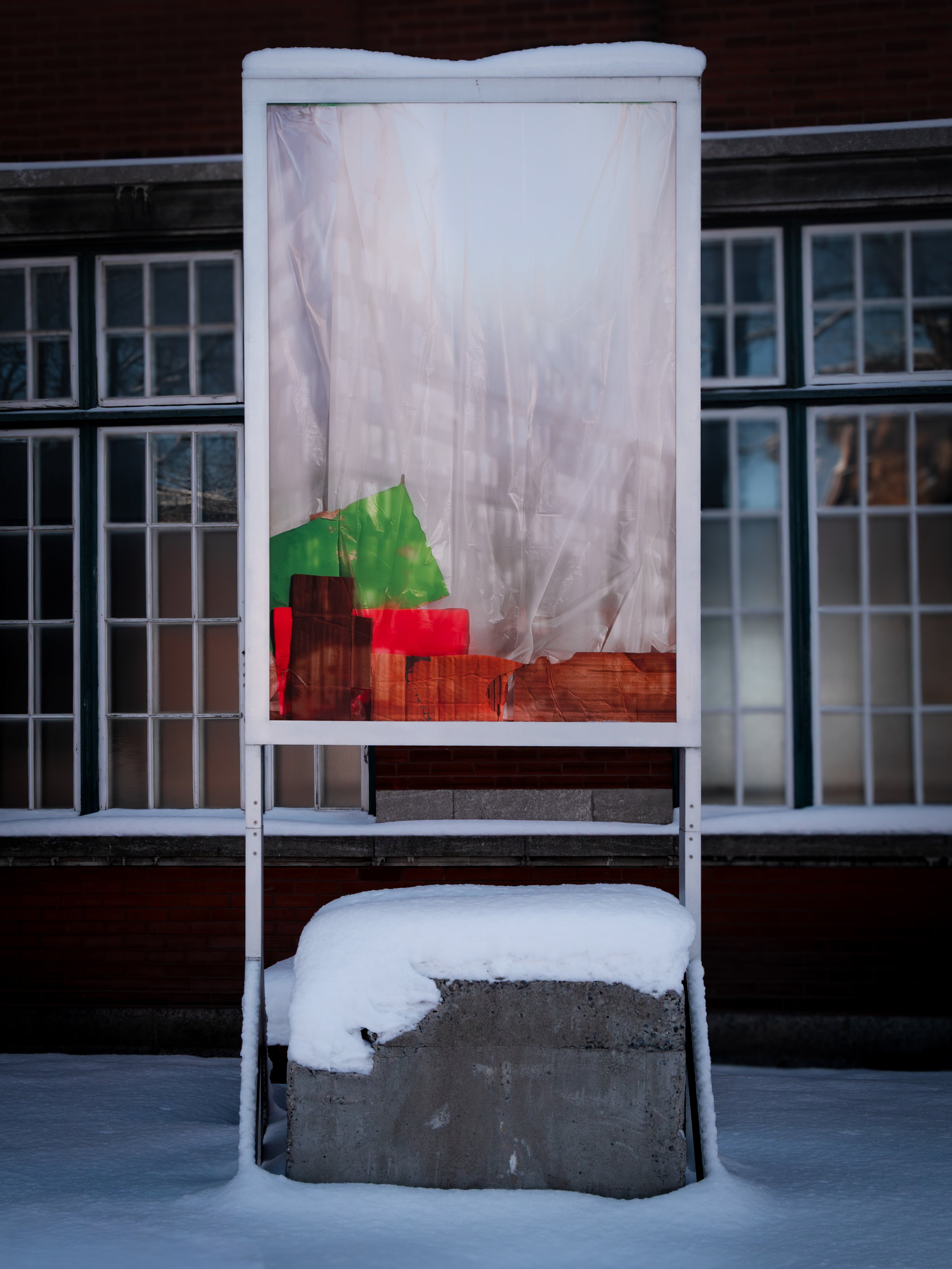 Vacant is part of Maxime’s contextual approach of discreet intervention in public space. Inspired by neglected storefront windows, the triptych evokes both the vacant shops of the neighbourhood and the precariousness of cultural spaces. Each image uses the backlighting of lightboxes to emphasize the strangeness of these abandoned displays, illuminated from within as if by accident.